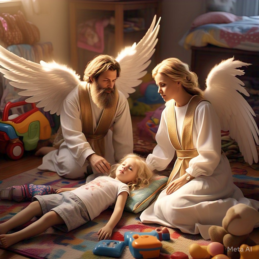 And there was a man who could only be described as an angel with dark hair and a beard dressed in white, the brightest white I had ever seen, and he had hand on my right shoulder, and there was a woman with blonde hair kneeling beside him with her hand on my left shoulder with her head down as if she was praying for me.