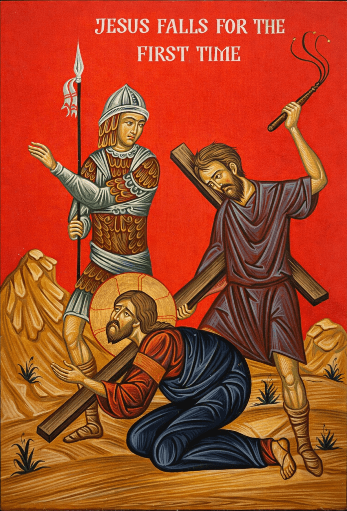 Laboring under the weight of the cross, Jesus begins His journey to Calvary. His agony in the garden had exhausted His body; He is in anguish from the brutal beatings; His strength fails Him, and he falls under the gruesome weight of the Cross.