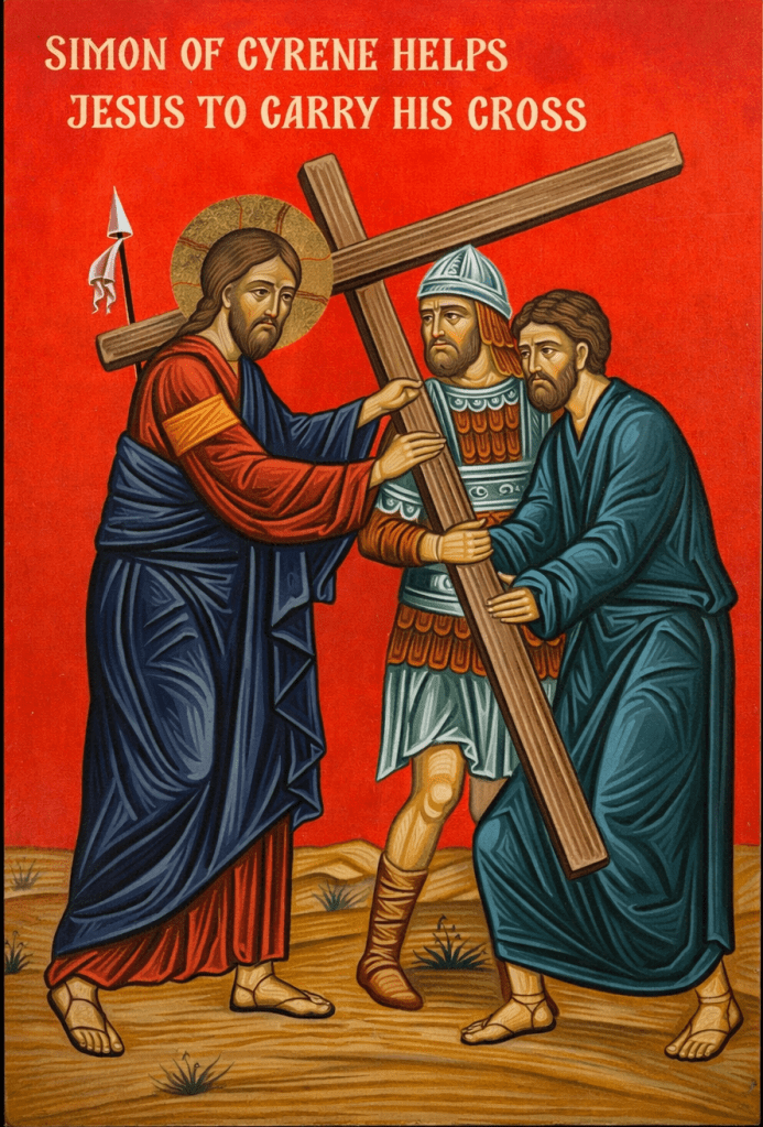 Recall how Simon of Cyrene was pressed into service when Jesus’ strength was exhausted, and he was forced to help Jesus carry His Cross.