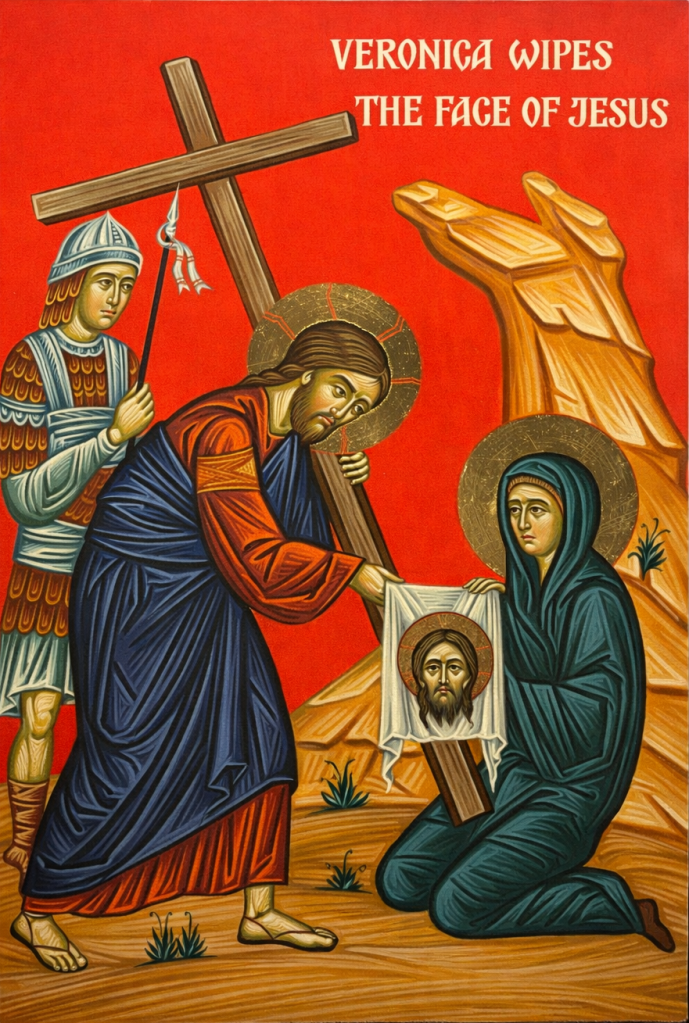 Recall (according to Christian tradition) how Veronica (a woman from Jerusalem) upon seeing Jesus so battered and bloody, offered Him her veil. Jesus took the veil, wiped His face, and left imprinted on the cloth the Image of His Divine Countenance.