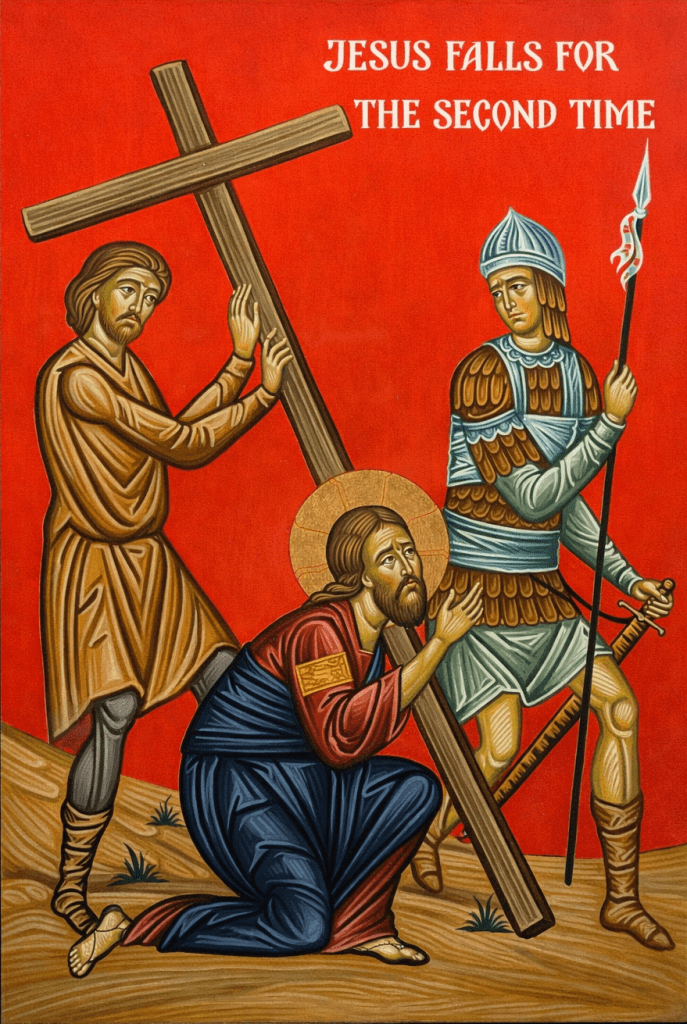 Recall how Jesus, bearing the Cross, and the weight of our sin, collapsed for a second time.